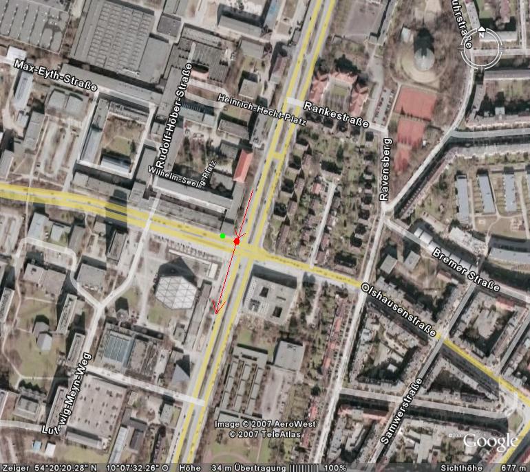 rot ist der weg das vermeintlichen übeltäters, grün war meine position und der rote punkt ist, wo der kerl mit dem rad an der ampel stand und ich ihn mit adleraugen erspäht habe ;)