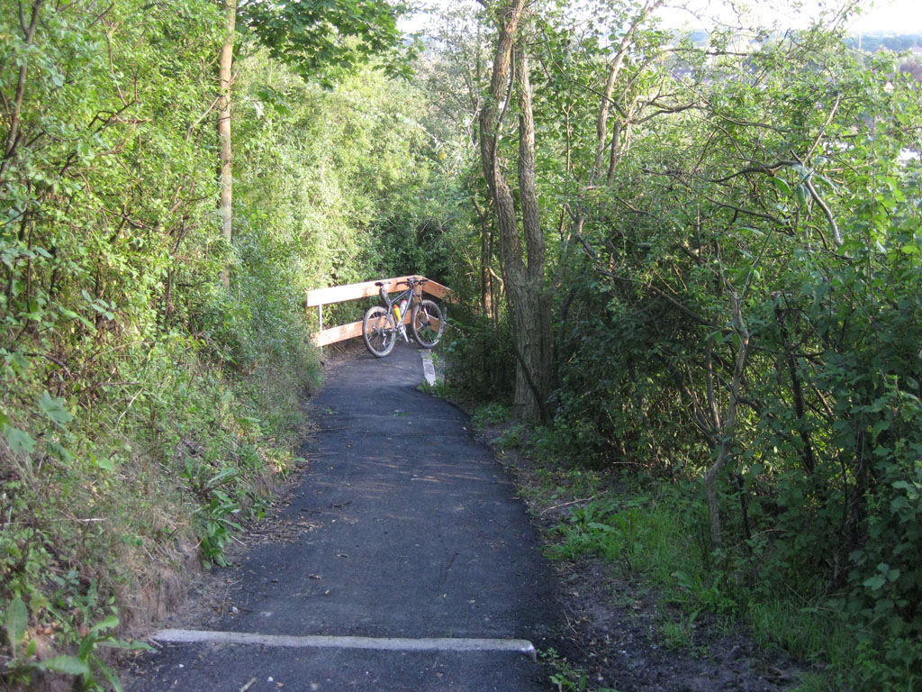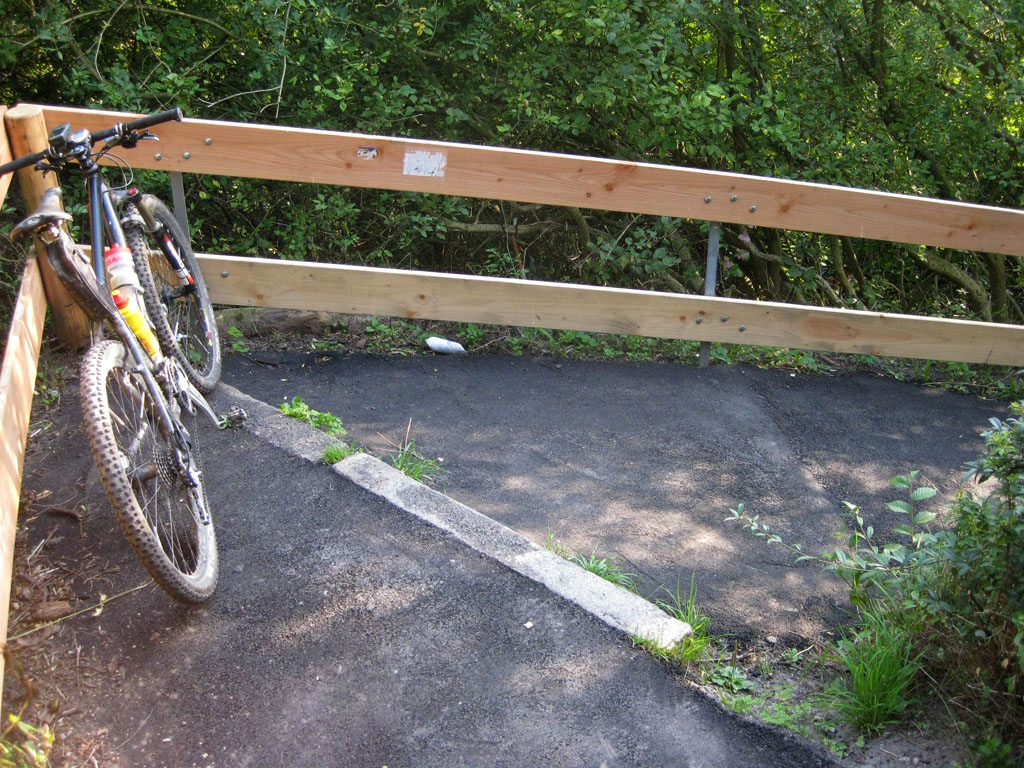 Die gute Nachricht: Der Trail hoch zur Brücke lässt sich wieder durchgehend fahren. Das Geländer ist wieder auf und das Bike muss nicht mehr drübergewuchtet werden.