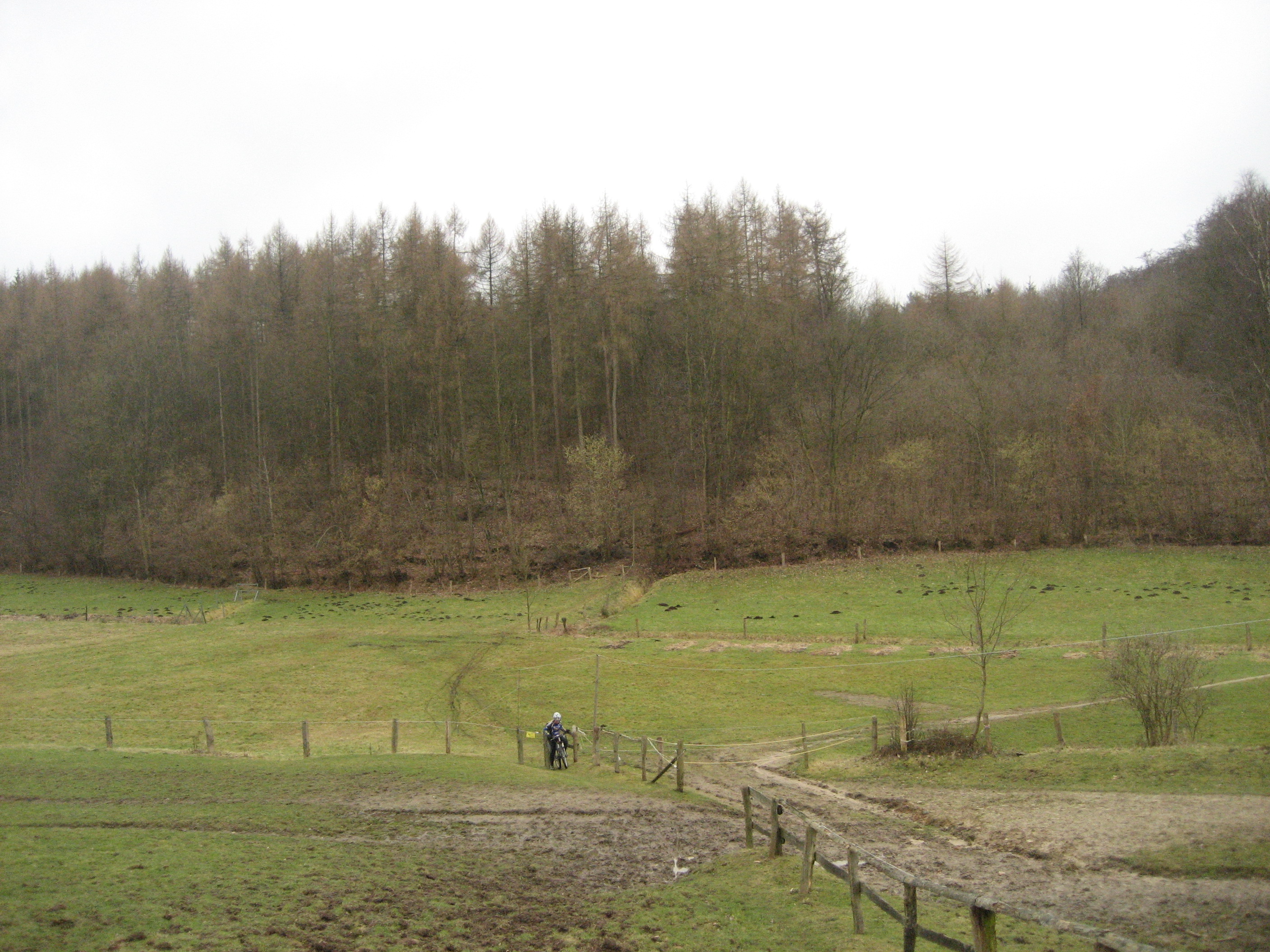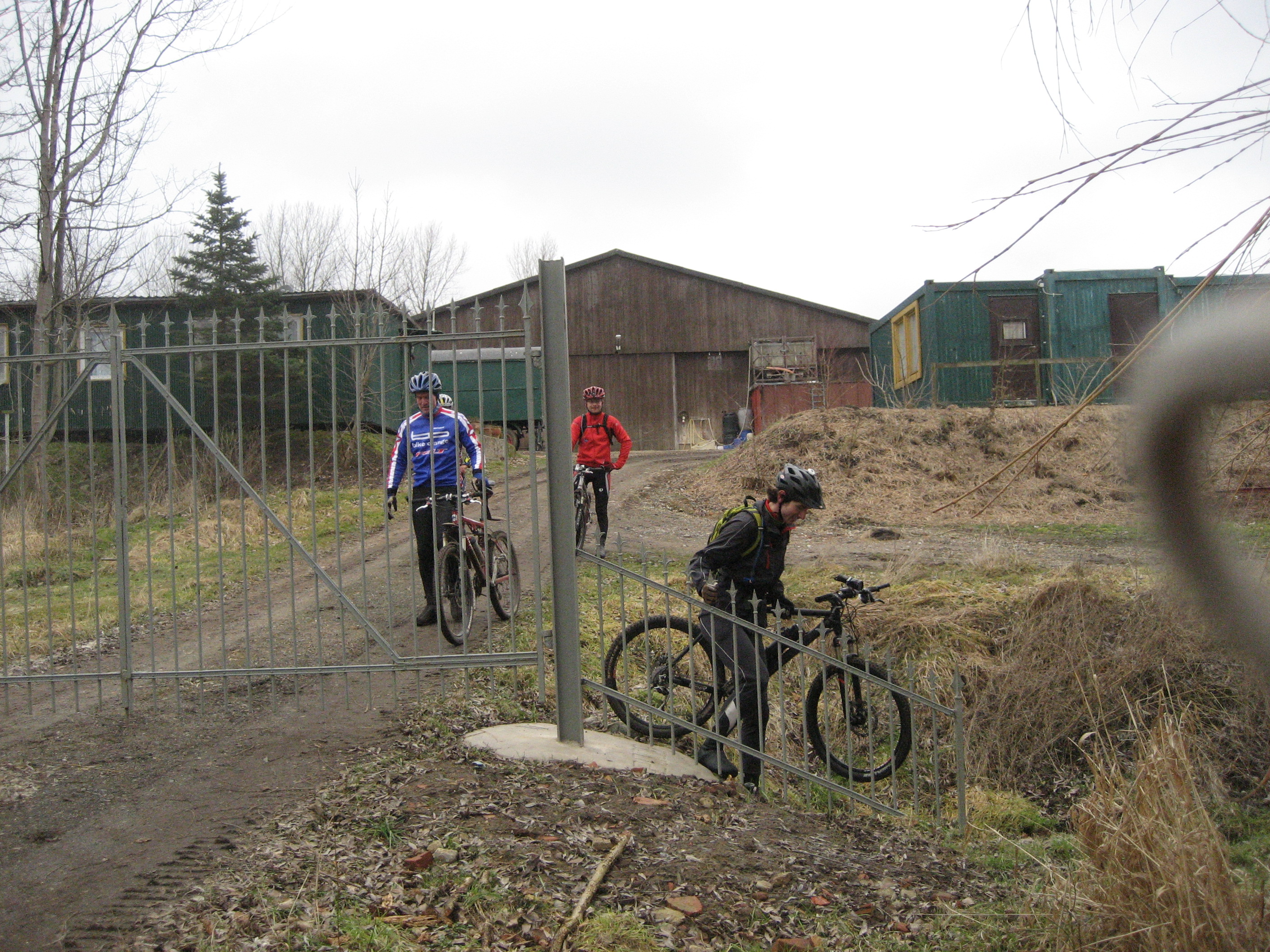 Nachdem ich mir einen Tennisarm gepumpt hatte, konnte es auch schon weitergehen. Ich warnte meine Mitfahrer, dass es gleich über Privatgrund geht und wir da zügig und bestimmt durchfahren sollten. Daraus wurde leider nix. Die Grundbesitzer hatten einen neuen Zaun aufgestellt, der zwar gestern schon da war, aber da war das Tor noch auf. David vermutete, dass in der Vergangenheit wohl zu viel MTBler da durch sind..:lol: Na gut, ich ging vor und zeigte den anderen, wie das Tor am besten zu umklettern ist. Anke und Andreas haderten noch etwas, konnten aber schließlich doch noch überzeugt werden, nach dem ich versichert habe, dass das Tor deren Seite absperrt und nicht unsere. :lol: Für die Zukunft hab ich aber schon eine Ausweichstrecke geortet. ;)