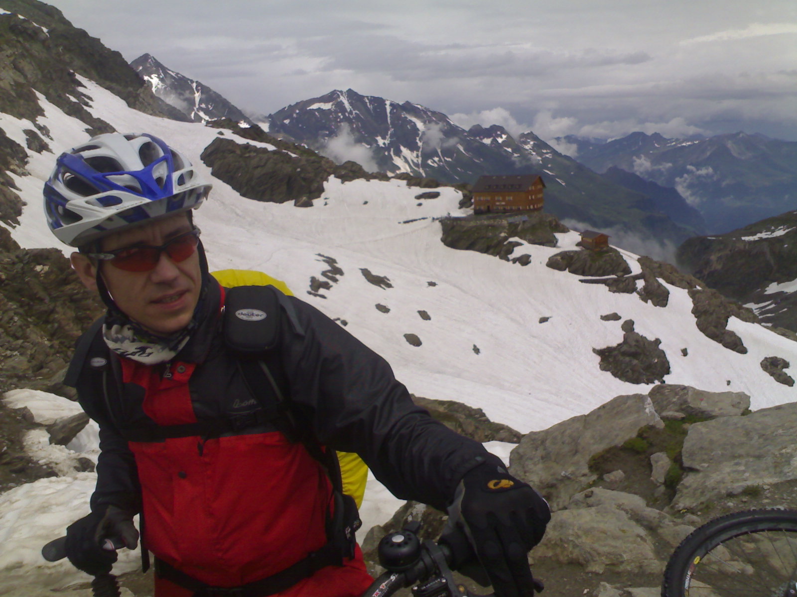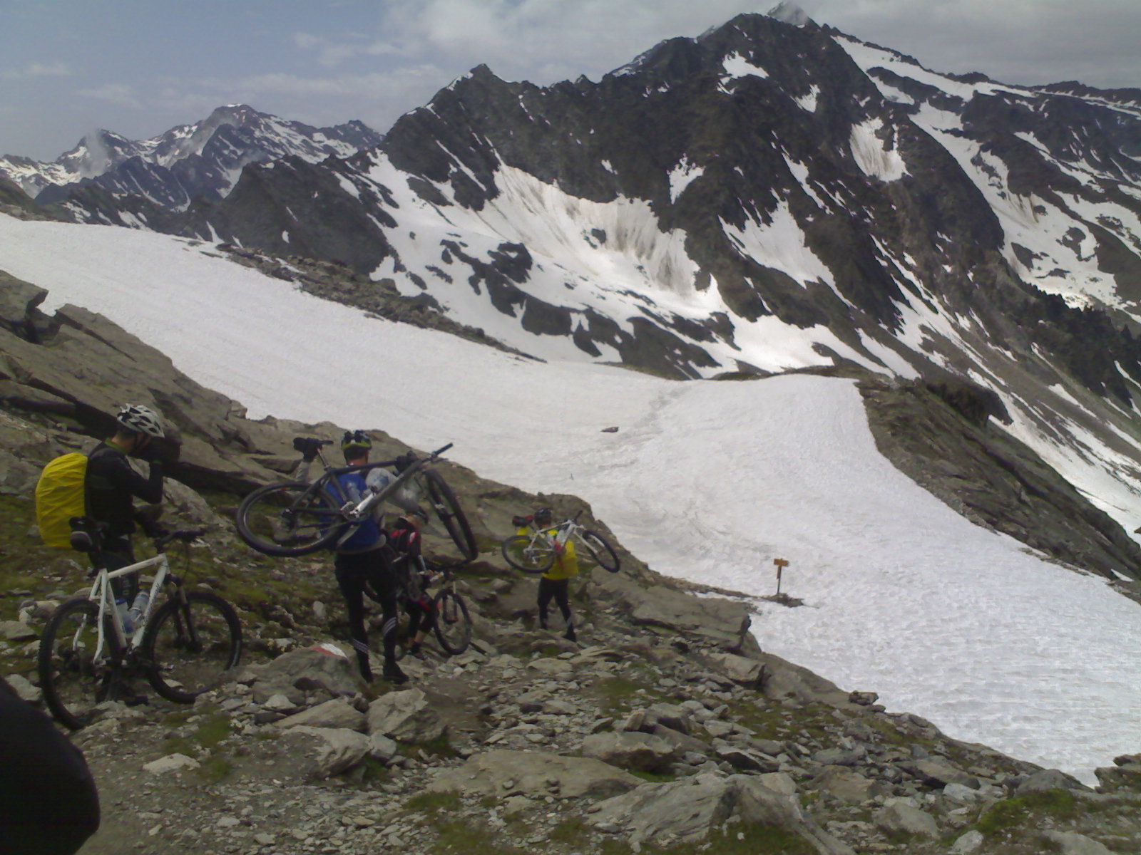 Außerdem noch die Bilder vom Aufstieg zum Eisjöchl, bei dem wir so einige Zeit im Schnee verbracht hatten und noch dazu in einen Regenguss gekommen sind, um endlich irgendwann in der Stettiner-Hütte eine Nudel-Wurstel- oder Knödelsuppe zu essen. Paul hat mal wieder das falsche bestellt und musste auf sein Spiegelei warten,bis wir fertig waren. Machte aber weiter nix, denn draussen fing es grad zu gewittern an,so dass wir sowieso erstmal das Unwetter abwarten mussten. nach einem Kaffee und 1,5h haben wir uns dann alles an Klamotten angezogen was wir im Rucksack hatten und sind dann die letzten 30 der 1200hm (wieder durch Schnee) übers Eisjöchl und danach hatten wir dann wieder ein Traum von Abfahrt. schön technisch! Aber leider ohne Happy End...:(
