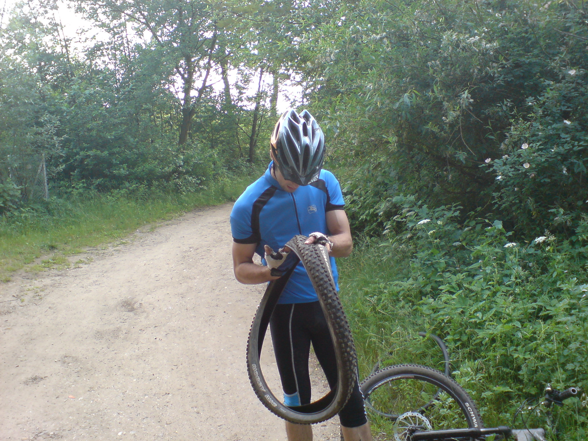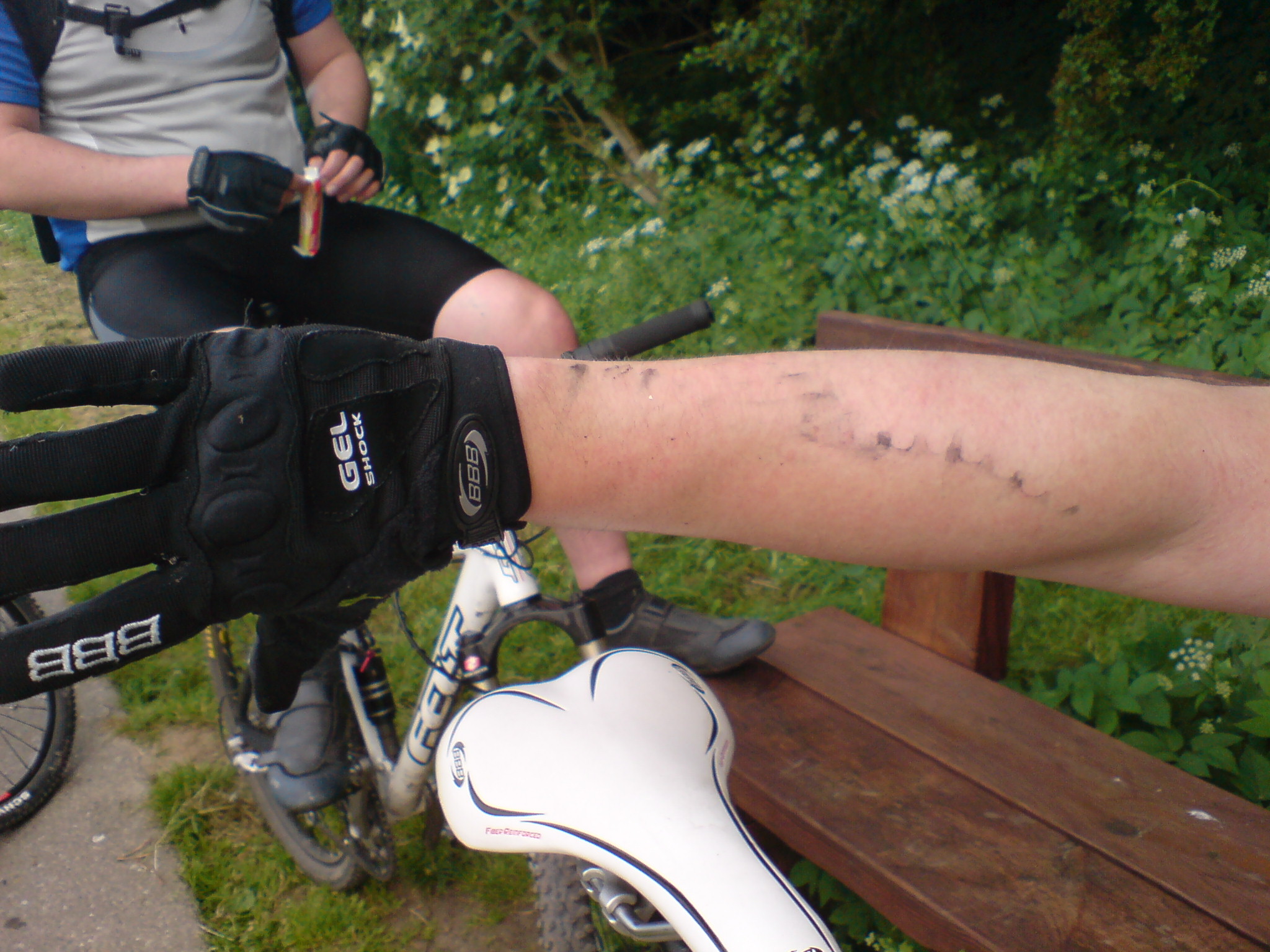 Zunächst sind wir durchs Projensdorfer Gehölz geradelt. Genau genommen haben wir hier die ersten 17 Kilometer unserer Tour abgespult. Ich denke, dieser Teil der Tour war noch einwandfrei. Allenfalls kann sich Paul beschweren, denn der hatte einen Platten. Und auch ich blieb nicht verschont. Zwar hatte ich keinen Platten, dafür aber einen Sturz, als ich einen Spezialtrail der dritten oder vierten Art fahren wollte. Ein Ast verfing sich im Vorderrad, ich ging zu Boden und das Rocky stürtzte sich auf mich. Ein dummes Gefühl, wenn das Pedal in den Helm schlägt und man den Kopf noch in Selbigem hat. Ok, mein Bein sah danach auch doof aus aber ich lebe ja noch.