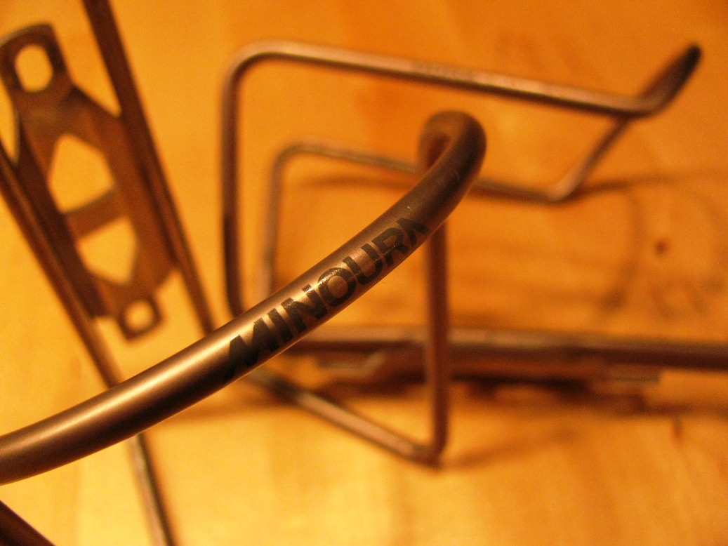 Als Flaschenhalter habe ich in meinem Fundus noch ein paar leicht gebrauchte 'Minoura Dura Cage' gefunden. Passenderweise in 'titanfarben'. Der eine wiegt 36g, der andere 38g. Dazu noch vier Befestigungsschrauben aus Aluminium zu je 1g.