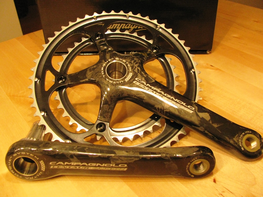 Als Kurbel habe ich mich für die Campagnolo Centaur Carbon entschieden. 172,5mm lang und mit Standard LK 135mm. Mit Kettenblättern wiegt die Kurbel 708g.