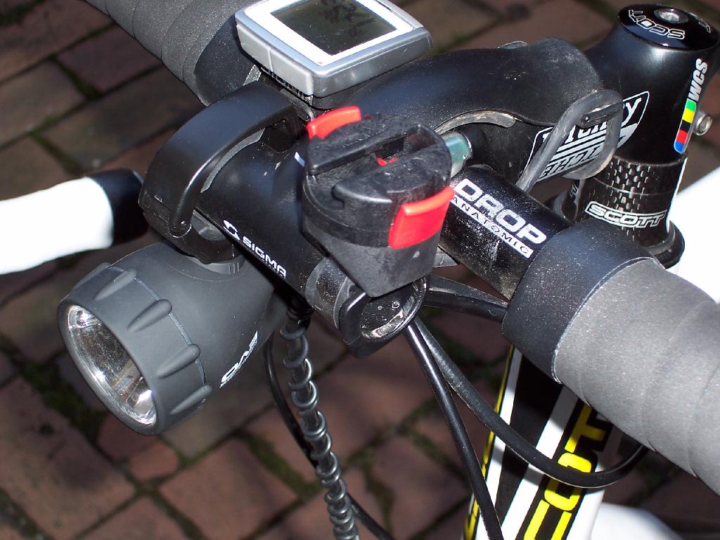 Den Minmap II habe ich auf den Vorbauhalter der Sigma Mirage montiert. Wichtig ist, das kleine dreckige Gummistück :twisted: unter der KLICKfix-Klemme mit zuverbauen, sonst rutscht der Halter nach hinten. Auf Kopfsteinpflaster wird man dann verrückt, wenn er auf den Vorbau einhämmert. Die Lampe muss auf dem Kopf am Halter befestigt werden, damit alles passt. Der Tacho kann am Lenker eingesehen und bedient werden. Die Montage auf dem Oberrohr fand ich doof.