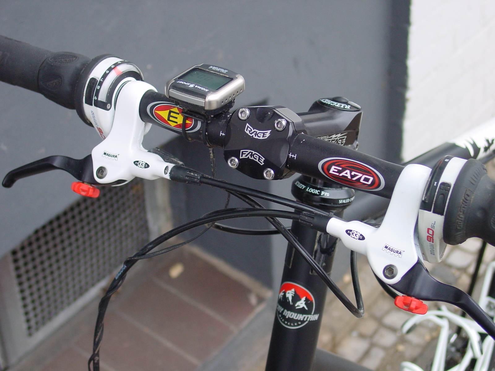 Die Kurbel musste, klar wie es sich für ein Rocky gehört, von Race Face sein. Auf der Eurobike stand das Rad mit einer schwarzen Kurbel aus Alu. Ich wollte sie in Weiß, was aber nicht einfach war. Schließlich fand ich im Netz das Carbon-Topmodell für einen unverschämt günstigen Kurs. Die Kurbel war mit 110er Lochkreis und Vierkantaufnahme ein Ausläufer. Da mein Bike auch untenherum weiß sein sollte, suchte ich weiße Pedale. Diese und ein weißes Sram 9.0 SL Schaltwerk mit passenden Griffen fand ich bei meinem damaligen Arbeitgeber in der Auslage. Als Umwerfer wählte ich einen einfachen Shimano Deore, da dieser schwarz mit weißem Schriftzug war und gut ins Konzept passte. Beim großen E ergatterte ich in einem heißen Duell mit einem anderen Kieler schließlich weiße Sram 9.0 SL Naben. Diese entpuppten sich allerdings bald als ziemlicher Schrott, aber sie waren halt weiß und das war wichtig. Die weißen Sunn Pedale zeichneten sich übrigens auch nur durch ihre Farbe aus. Bei meinem ersten Marathon überhaupt in Altenau brach ein Teil der Klick-Mechanik einfach ab. Ich wechselte recht zügig zu Shimano 959 Pedalen, die immer noch halten. Vorbau und Sattelstütze kamen auch von Race-Face und waren schön schwarz, wenn auch nicht ganz leicht, so doch schon allein betrachtet zwei Kunstwerke für sich. Beim großen E fanden sich auch noch weiße Barends von Onza und als Sattel kam ein Pavé Team AG2R von Fizik ans Bike, na klar mit weißen Flanken. Bei Magura orderte ich eine schwarze O24U und ein HS 33- Sondermodell in weiß. Ich war glücklich!