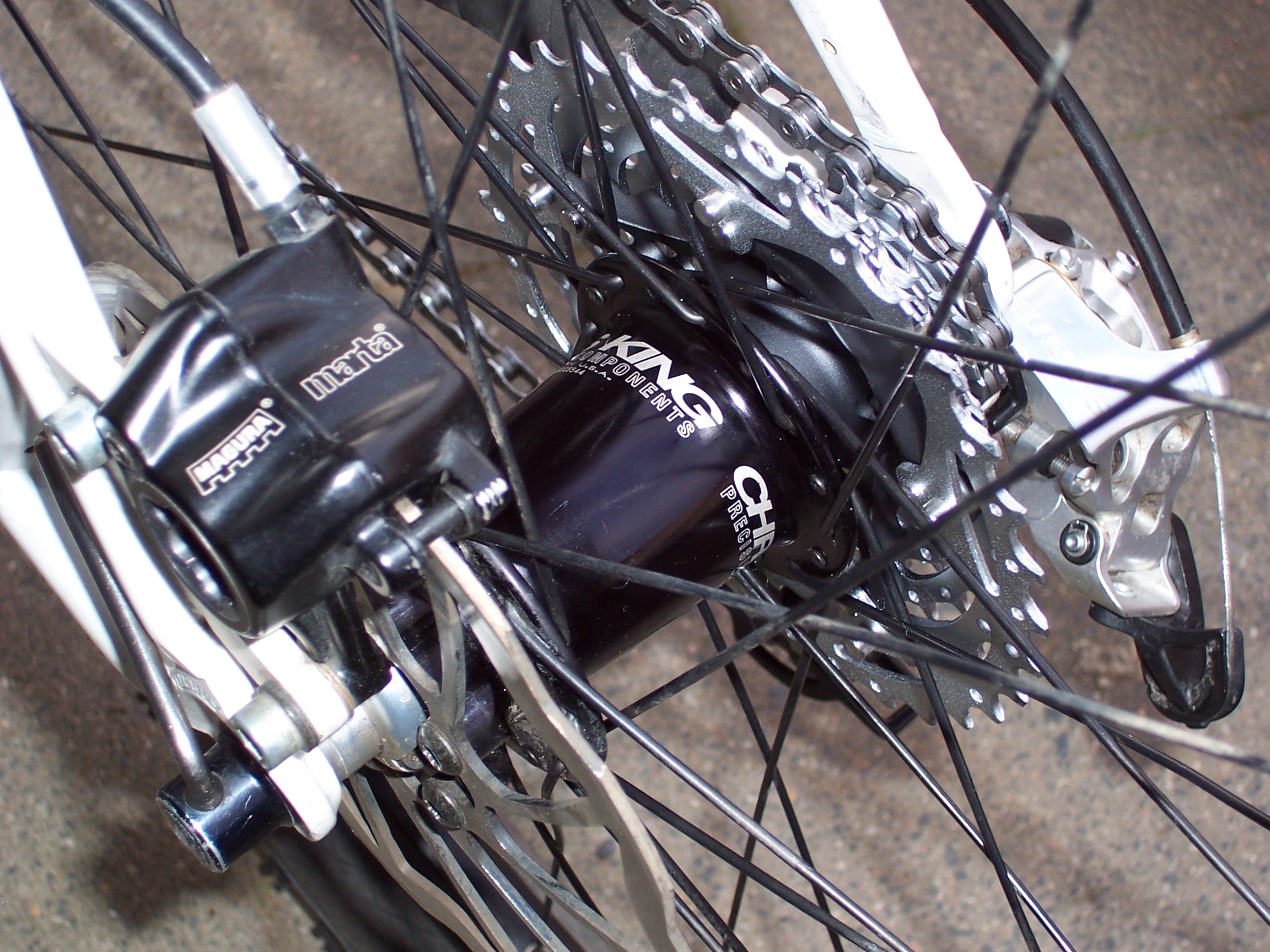 In der Zeit als sich mein 26 Zoll Fuhrpark immer mehr dezimierte und das Rocky immer klarer mein Favorit wurde aber noch zahlreiche MTB-Marathons auf meiner Agenda standen, musste das Rocky abspecken. Dieses Unterfangen war natürlich recht sinnlos, da allein der Rahmen so ca. 2,3 Kilo auf die Waage bringt. Aber leichter als Stufe 1 konnte es alle Mal werden. Das ursprüngliche Farbkonzept geriet etwas ins Hintertreffen. Der Pavé musste einem SLR Sattel weichen. Auf Vorbau, Lenker und Steuersatz prangte nun stolz das WCS-Logo von Ritchey. Die Laufräder wichen den Crossmax XL von Mavic und die Magura HS 33 wich einer V-Brake. Ich wählte hier die Sram 9.0, deren Arme allerdings nach einigen Kilometern immer unbeweglicher wurden. Als Hebel fuhr ich nun weiße 9.0 SL Hebel ebenfalls von Sram. Ich weiß noch, dass es ein ziemlicher Zirkus war, die Dinger zu bekommen, da alle Welt nur noch den linken Hebel hatte. Den rechten fand ich nach einiger Zeit bei Ebay. Die Dinger waren allerdings windelweich und verwanden sich bei jeder Bremsung. Mehrfach wähnte ich schon, den Griff vom Lenker gerissen zu haben, was allerdings nie geschah. Kurzzeitig, als die Bremsarme oder deren Lager gar nicht mehr wollten, hatte ich eine kupferfarbene Avid SD Ti am Blizzard. Diese stammte noch aus der Stevenszeit und arbeitete klasse, war optisch aber etwas daneben. Erwähnt werden muss noch der Freilauf der Crossmax-Laufräder, der immer im Winter nicht mehr so recht drehen wollte. Eine Eigenschaft, die ein guter Freilauf besser nicht haben sollte. Ach ja, die bleischweren aber weißen Onza Barends wichen welchen von Post Moderne mit einem überragenden Preis/Gewichtsverhältnis. Eine XTR Kassette mit ordentlich Titan kam auch noch ans Bike ebenso wie die leichte XTR Hollowtech II Kurbel.