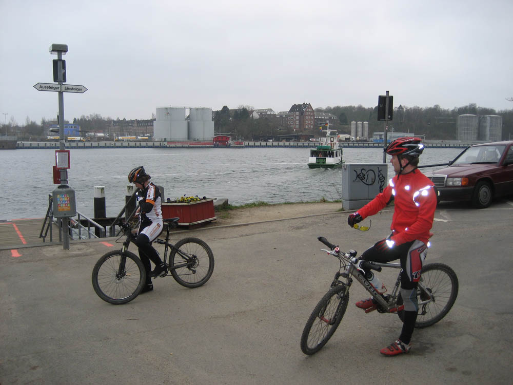 Um gegen Ende der Tour wieder etwas zurück auf die Grundaussage der Tour (Stichwort "gemütlich" und "cruisen") zu kommen bot ich an, mit der Adler übern Kanal zu schippern, was teilweise auf große Begeisterung stieß. Damit hatten wir uns allerdings ein dickes Ei gelegt, denn die Fähre fuhr uns vor der Nase davon und so wurden aus 22hm vom Fuße der Hochbrücke bis zum "Gipfel" dann ganze 52hm am Stück!