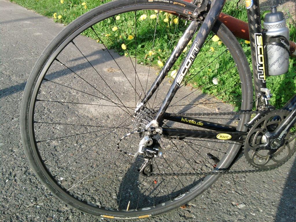 Die Naben sind mit einem Satz Hügi 240 aus Maikes MTB auch schon gesetzt. Die hintere Nabe lasse ich gerade bei Whizz-Wheels auf 130mm Rennradmaß umbauen und mit neuen Lagern sowie Campa-Rotor bestücken. Die VR-Nabe bekommt bei der Gelegenheit auch gleich einen Service und neue Lager.