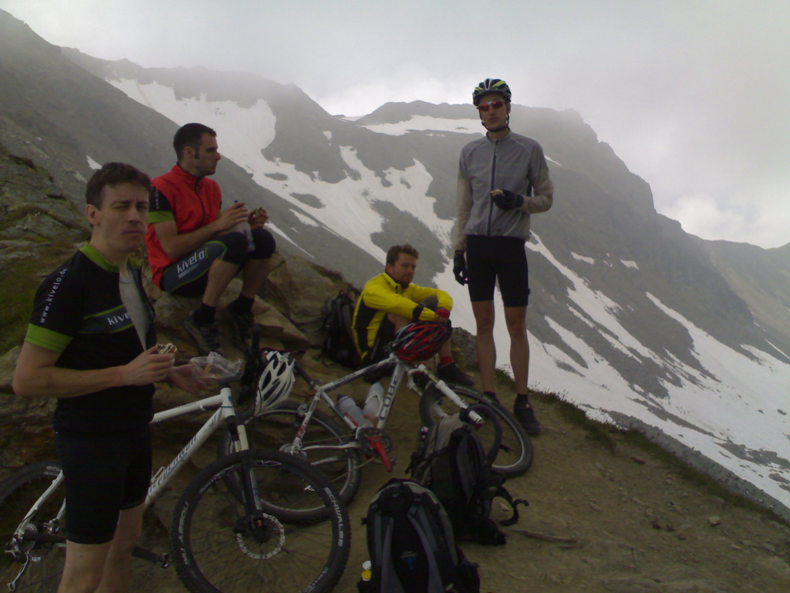 Nach kurzem aufenthalt gings mit dem rad auf dem rùcken 500hm ùber fels,schotter und schnee auf den gipfel.wàhrend paul,jòrn und karsten murmeltieren nachstellten machten felix und ich es uns auf dem gipfel bequem. Die schinderei wurde glùcklicherweise mit einer unglaublichen 1660hm singletrailabfahrt belohnt. Unterbrochen wurde der rausch lediglich von platten an felix und meinem bike.mein platten stellte sich allerdings als lebenssettung heraus.meine vordebremse hatte irgendwie keine feste verbindung zur gabel mehr. Aber alles ging gut und weiter fuhren wir gen tal.an den trail schloss sich eine geteerte serpentine an. Spitzengeschwindigkeit von paul mit 65kmh. Was ein spaß.