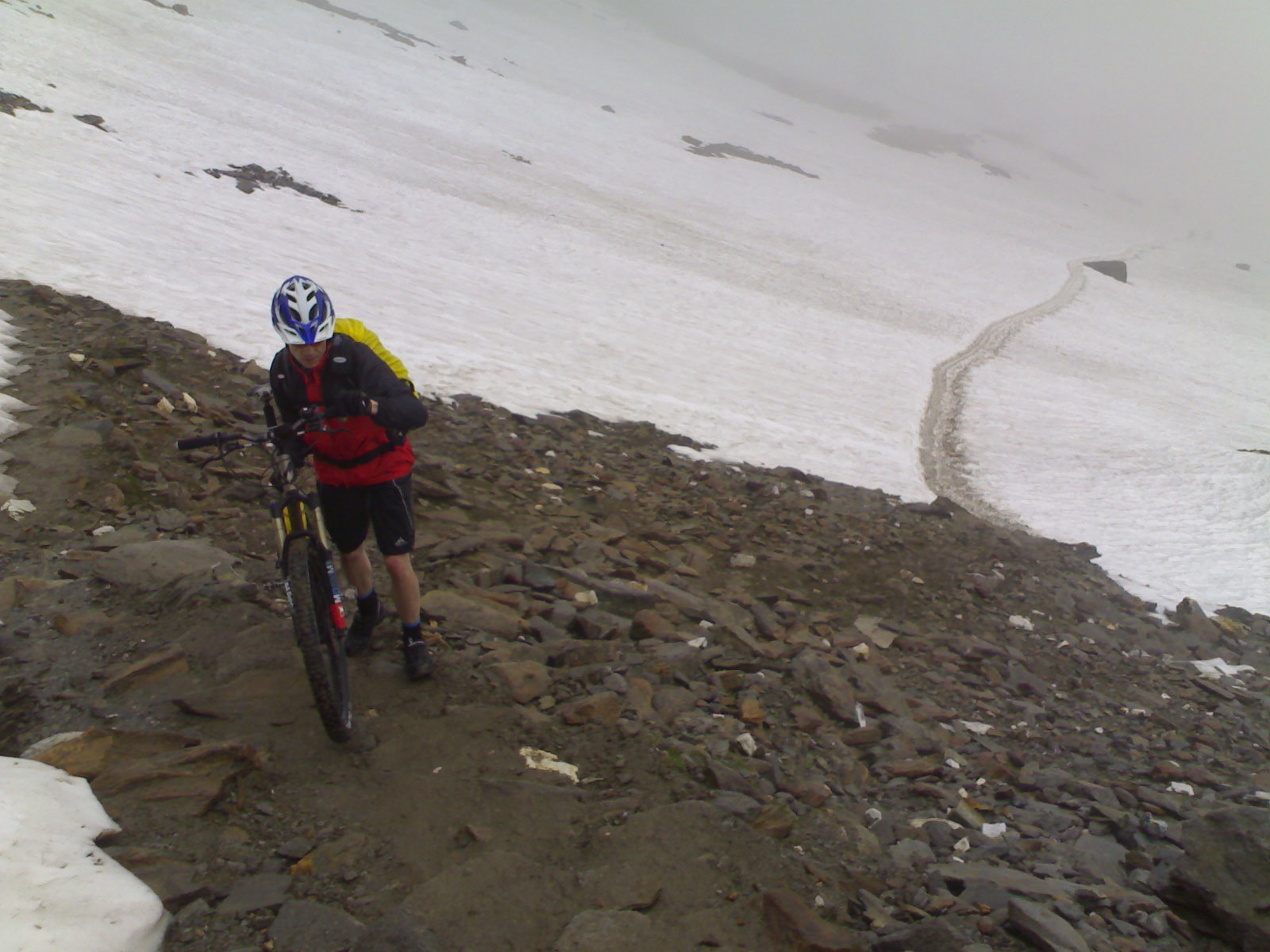 Außerdem noch die Bilder vom Aufstieg zum Eisjöchl, bei dem wir so einige Zeit im Schnee verbracht hatten und noch dazu in einen Regenguss gekommen sind, um endlich irgendwann in der Stettiner-Hütte eine Nudel-Wurstel- oder Knödelsuppe zu essen. Paul hat mal wieder das falsche bestellt und musste auf sein Spiegelei warten,bis wir fertig waren. Machte aber weiter nix, denn draussen fing es grad zu gewittern an,so dass wir sowieso erstmal das Unwetter abwarten mussten. nach einem Kaffee und 1,5h haben wir uns dann alles an Klamotten angezogen was wir im Rucksack hatten und sind dann die letzten 30 der 1200hm (wieder durch Schnee) übers Eisjöchl und danach hatten wir dann wieder ein Traum von Abfahrt. schön technisch! Aber leider ohne Happy End...:(