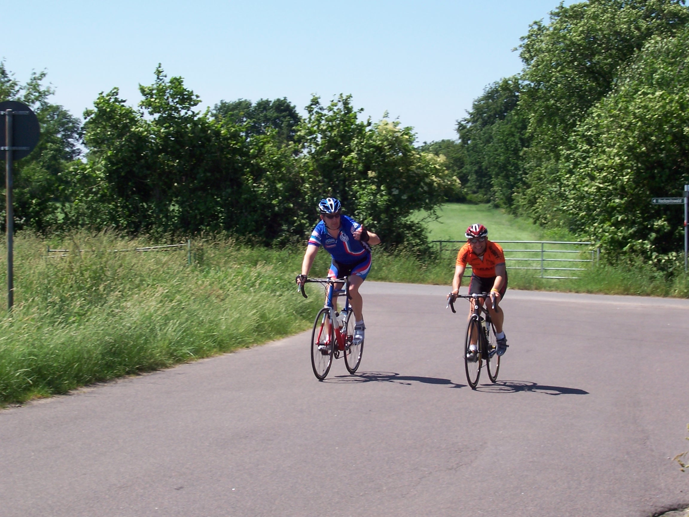 Der Anschluss war weg und ich war ziemlich alleine zwischen zwei größeren Gruppen. Zum GLück kam so bei Km 25 eine 4er Gruppe zu mir hin, mit der ich dann in guter Zusammenarbeit bis zum ersten Depot gerauscht bin, wo ich dann auch Jan zum ersten Mal traf. Nach dem Depot hatte sich unsere Gruppe auf ca. 20-25 Mann vergrößert und bis zum 2. Stopp wurde in wirklich guter Zusammenarbeit ein flottes Tempo von ca. 35-36Km/h vorgelegt, so dass auch wenig Zeit blieb die Landschaft zu genießen. Nach dem 2. Depot war unsere Gruppe plötzlich kleiner, zuerst waren wir noch zu siebt, wobei 2 Vereinsfahrer aus Oeversee für das Tempo sorgten, aber nach der Streckentrennung 150/110 blieb mir nur eine 4er Gruppe, in der ich mich schnell als (zu dem Zeitpunkt) fittester herausstellte (man sollte aber fairer weise auch sagen, dass die anderen drei bis zu 20 Jahre älter waren als ich). Von Km85 bis kurz vorm Ziel leistete ich also alleine die Führungsarbeit, was mir komischerweise sehr leicht viel. Ein paar Km vorher fühlte ich mich echt schlecht, aber plötzlich lief es wie geschmiert, nennt man wohl 2. Luft. So ca. 5 Km vor dem Ziel kam dann plötzlich eine Gruppe mit ca. 5 Mann von hinten in der auch Jan saß, was mir ganz recht war, denn so konnte ich bis zum Ziel nochmal ein paar Meter im Windschatten genießen.