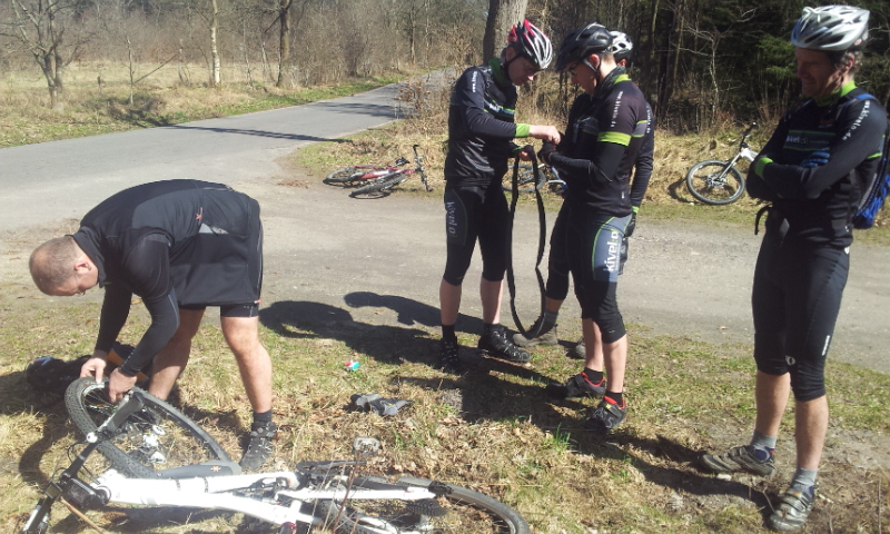 Wir machen grad ne Pause. Nur Sascha muss arbeiten. Und zwar seinen 2. Platten auf drr heutigen Tour flicken. Allerdings wird ihm geholfen... 4 Leute an einem 29er :roll: