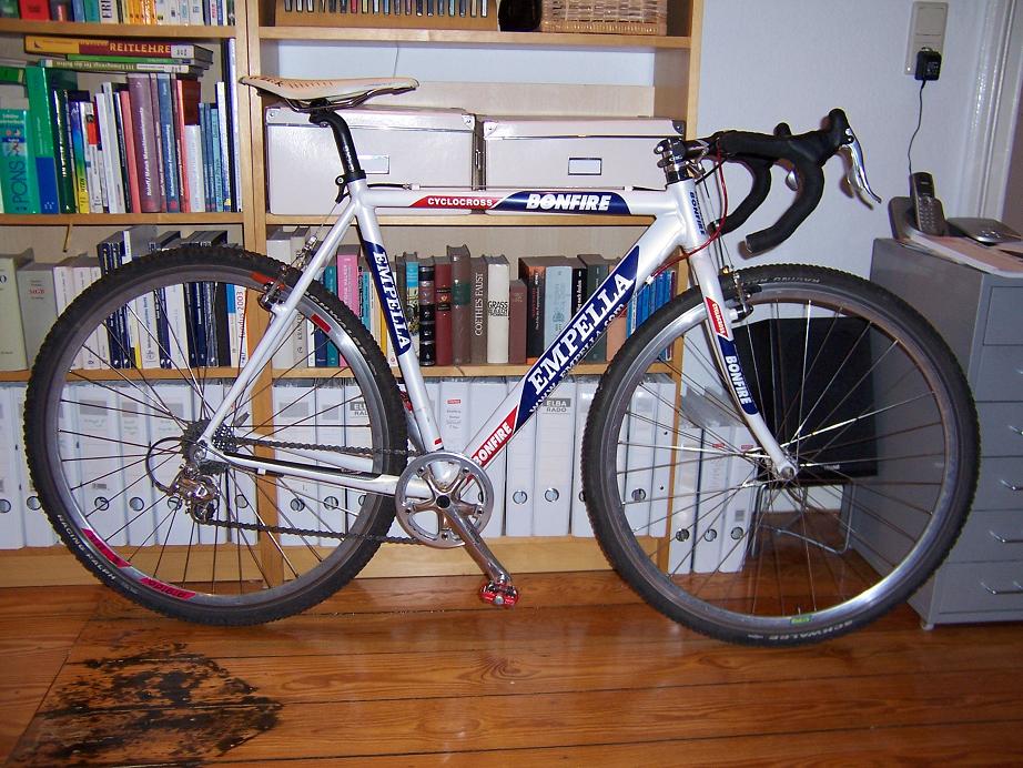 Aus finanziellen Gründen beschloss ich nur die Anschaffung eines neuen Rahmens, denn den Rest der Teile sollte vom Rennrad übernommen werden. In meinem Fundus fand sich dann auch noch eine passable Crossgabel aus Stahl und eine schöne XTR-Kurbel mit Kettenblättern in den gewünschten Zähnezahlen 46/38. Die Teile waren also vorhanden und ich wollte zur Bestellung schreiten. Eine Auswahl war schnell getroffen, es sollte genau der gleiche Rahmen werden, den ich schon in meinem ersten Crosser verbaut hatte; ein Droessiger Rahmen aus Aluminium in dezentem schwarz. Der Hersteller zeigte sich jedoch bockig und wollte wohl kein Geld an mir verdienen. Pech gehabt! Aber es gab ja noch andere Möglichkeiten. Über dunkle Kanäle wurde mir dann zunächst ein Quantec angeboten, das für den aufgerufenen Preis eine ordentliche Performance versprach, jedoch nicht so ganz meinem Geldbeutel gefiel. Auf der CTF in Ratzeburg eröffnete sich dann eine andere Möglichkeit, die auf den Namen EMPELLA hörte. Einer der Teilnehmer hatte sich ein neues Rad gekauft und wollte nun den alten Rahmen loswerden. Leider hing an dem Rahmen noch ein Chris King Steuersatz, die Sattelstütze, Vorbau und der Lenker, was den Preis dementsprechend hochschraubte. Versteht mich nicht falsch, das Angebot war wirklich gut, aber eben auch dem Wert der Teile entsprechend. Also wieder nix. Beim Namen EMPELLA fing mein Hirn aber schlagartig an zu arbeiten (was es sonst wohl selten tut