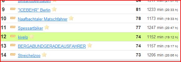 Huiii, Platz 126 (kivelo2) zu Platz 51 (kivelo1). Da musst Du morgen wohl nochmal ne extra-Runde fahren, Thies. :lol: